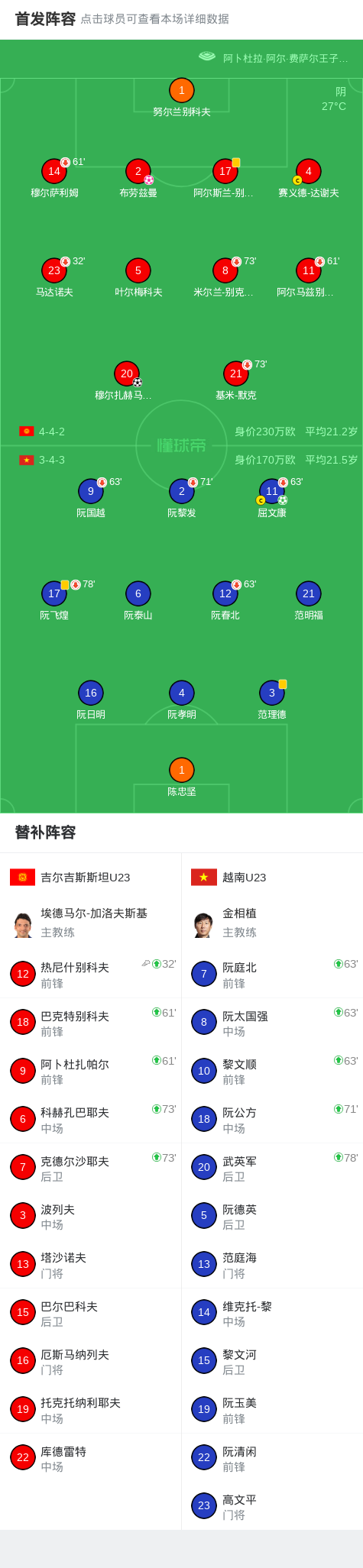 第44分钟,吉尔吉斯斯坦U23球员热尼什别科夫助攻穆尔扎赫马托夫打入一球。